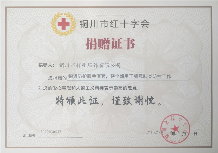 銅川市紅十字會捐贈證書